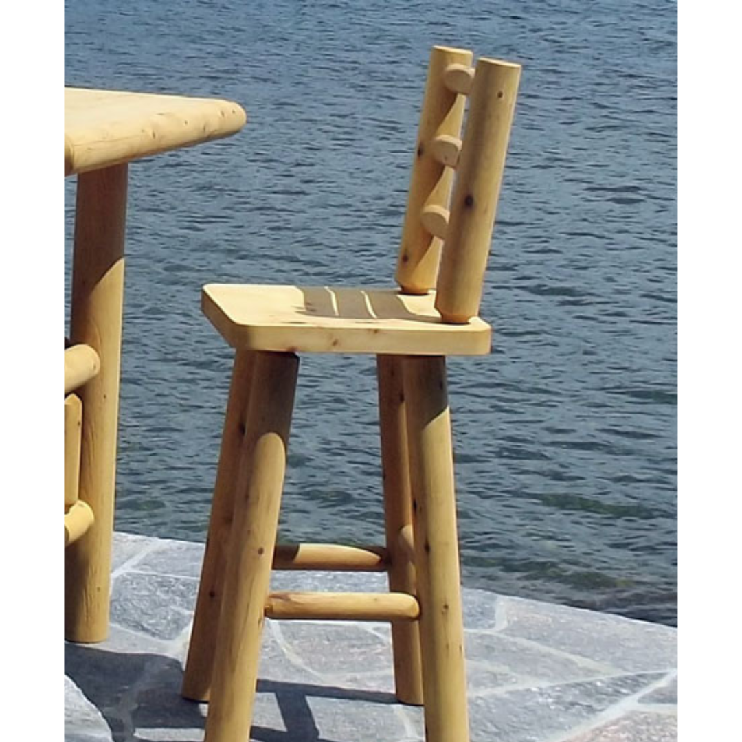 What better way to enjoy a drink overlooking the lake than perched on this fabulous ladder bar stool? With a comfortable back and convenient bar height, it matches either of our tiki bars. Made from white cedar the well defined grain and knots enhance its rustic appeal. Either left unfinished or stained it's a real thing of beauty. Chairs sold individually. Bar not included, sold separately.